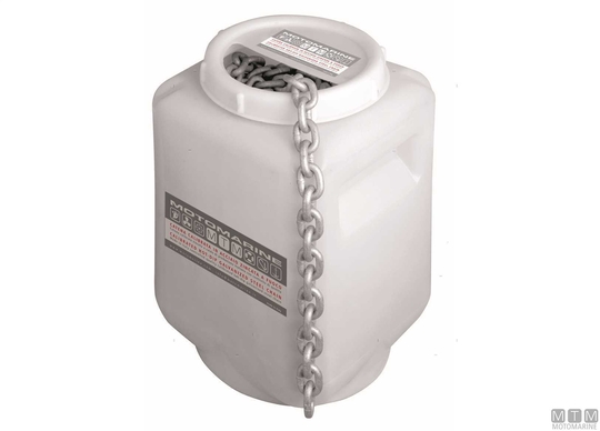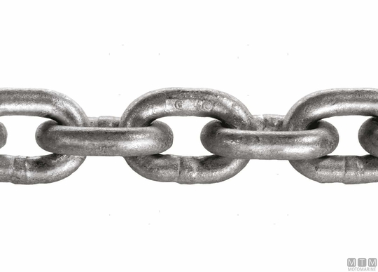 DIN766 vroče pocinkana jeklena kalibrirana veriga za sidrne vitle. G40 razred, nadzorovana proizvodnja, z visoko pretržno obremenitvijo. Opomba: pretržna obremenitev verige je 4-krat večja od delovne obremenitve. Na voljo v paketih po 30, 50, 75 ali 100 metrov.