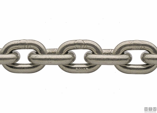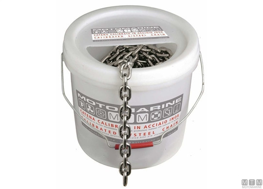 DIN766 316L nerjaveča jekla kalibrirana veriga za sidrna vitla. Razred G40, nadzorovana proizvodnja, z visoko pretržno obremenitvijo. Opomba: pretržna obremenitev verige je 4-krat večja od delovne obremenitve. Na voljo v snopih dolžine 30, 50, 75 ali 100 metrov.