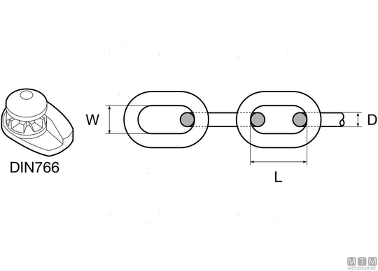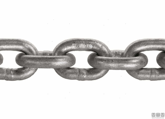 Visoko odporna DIN766 vroče pocinkana jeklena kalibrirana veriga za sidrne vitle.↵ Nadzorovana proizvodnja, razred G70 z zelo visoko natezno trdnostjo.↵ Opomba: mejna sila pretrganja verige je 4-krat večja od delovne obremenitve.↵ Snop: 30, 50, 75 ali 100 metrov.