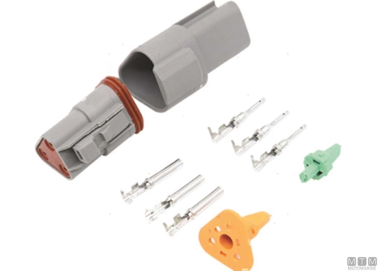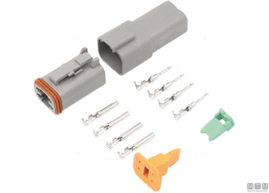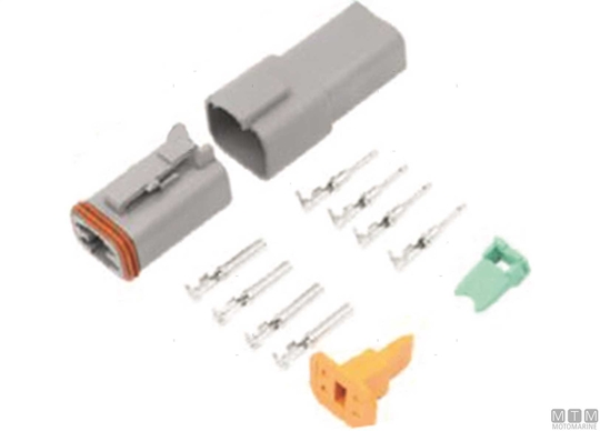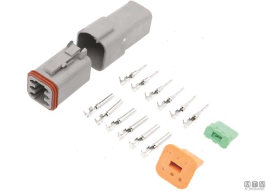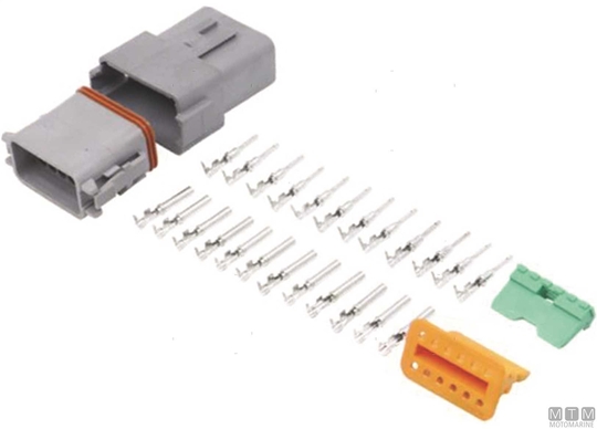 Vodotesni hitri priključni terminal, komplet s kontakti za kable od 0,75 do 1,5 mm², max 13A. Idealno za električne sisteme, kjer so naprave pogosto priključene in izključene, kot so kalupne črpalke, instrumentacija in senzorji.