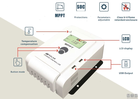 MPPT tehnologija kontrolerja polnjenja za fotovoltaične sisteme, ki izterja odvečno napetost in jo pretvori v dodatno polnjenje ter doseže učinkovitost 97%. Primeren za katerokoli svinčeno-kislinsko baterijo, vključno z AGM in gelnimi. Ni združljiv z litijskimi in NiMH baterijami. Vključuje LED zaslon, dvojni 2A USB priključek, neposredni uporabniški izhod in zaščitna vezja za izogibanje kratkemu stiku, prenapetosti in obratni polariteti.