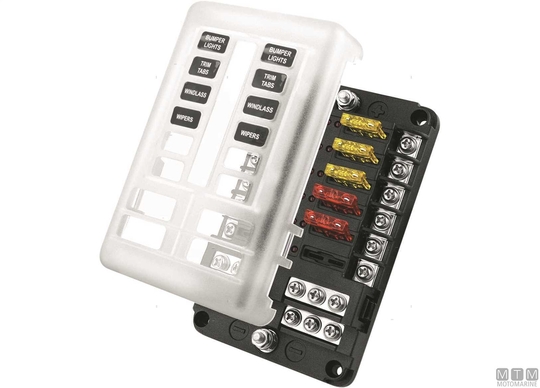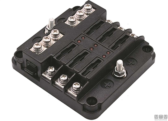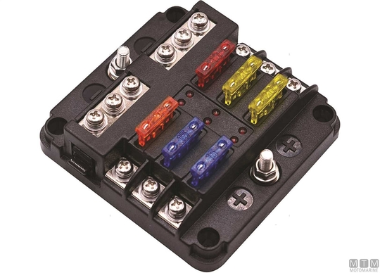 Standardni blok varovalk z midi rezilom s skupnim pozitivom in razdelilno letvijo.↵ Modulne enote za medsebojno povezovanje z vijačnimi terminali za večjo varnost.↵ LED indikator alarma, ki se aktivira, ko je varovalka pregorela.↵ Prozoren zaščitni pokrov. Lepilne nalepke s simboli pripomočkov.↵ Popolno z varovalkami.