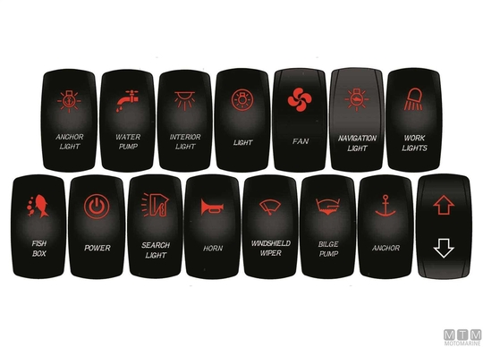 Nitrilna tesnila IP68 vodoodporni 12/24V (20/10A) preklopni stikali. Z lasersko graviranimi aktuatorji, ne potrebuje nalepk in se ne obrabi. Simbol je vedno osvetljen (rdeča LED), medtem ko se besedilo nalepke osvetli (bela LED) ko je stikalo aktivirano.