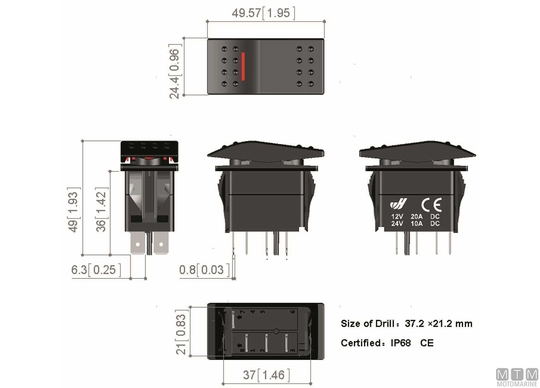 Nitrilna tesnilka IP68 vodoodporni 12/24V (20/10A) preklopni stikali.↵S rdečo LED-lučko, ki sveti, ko je stikalo aktivirano.↵ON v oklepaju (On) označuje trenutni položaj.