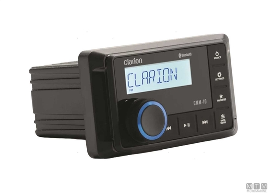 Kompaktna stereo enota Clarion CMM-10i z LCD zaslonom in osvetljenimi tipkami. AM/FM radio, pripravljen za DAB+ z RDS, USB priključkom in dvema zadnjima AUX vhodoma. Predvajalnik MP3/WMA s integriranim Bluetoothom za pretakanje zvoka iz pametnega telefona. Vgradnja na ravno površino z vodoodpornim ohišjem IP66. Vključuje povezovalne kable, okvir obrobe in vijake.
