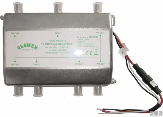 Omnidirectional Glomex V9150AGC Adhara TV antenna for analogue/digital TV signals. Ideal for any type of boat. Thanks to the 55 mm height shark fin it is able to receive vertical and horizontal polarized TV signals. Endowed with stylus for receiving the DAB signal and automatic gain control amplifier (AGC) that ensures a perfect signal either at sea and at berth. The reinforced base with the micro-fused Stainless Steel mount ensures the best antenna's stability in all sea conditions. With the optional V9147 splitter, installed between the antenna and the amplifier, the antenna can also receive AM-FM radio frequencies. With 6 TV devices. Frequency 87,5/774 MHz, 174/240 MHz DAB - Impedence 75 Ohm - Universal power supply 12/24V. Complete with 3x20 m coax cables and TV set cord.