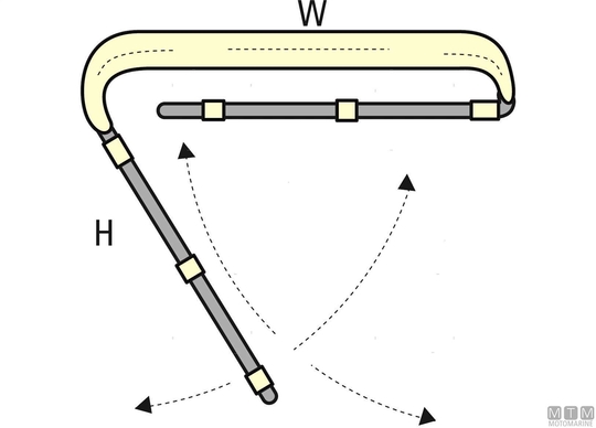 3 pramena sončne strehe bimini za vodo. Bela lakirana aluminijasta konstrukcija, 100% poliester s PVC prevleko. Cevke premera 20 mm.