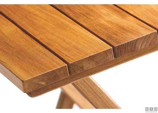 Miza iz tikovine, odporna na morske in UV žarke. Izjemna kakovost in vrhunska obdelava. Strojna oprema iz nerjavečega jekla 316. Zložljiva krila za dve različni širini (40 cm z zloženimi in 80 cm z odprtimi krili). Nastavljiva višina po potrebi, 60 ali 75 cm.