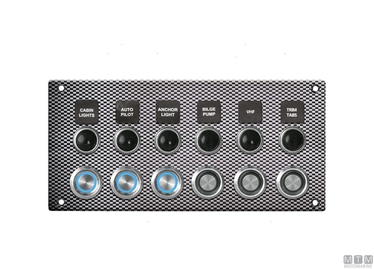 IP65 Vodoodporna aluminijasta plošča z gumbi iz nerjavečega jekla premera D19 mm, 12/24V-15A, modra LED lučka in avtomatski ponastavljivi odklopniki. Vključno z montažnimi vijaki in kompletom nalepk.