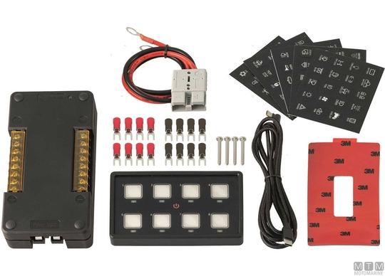 Vodoodporna plošča 12/24V s 10A na dotik stikala in LED lučjo. Opremljena z Bluetooth povezljivostjo za upravljanje gumbov preko pametnega telefona z uporabo brezplačne aplikacije. Dobavljeno z nadzorno omarico, priključnim kablom, vijaki in kompletom nalepk.