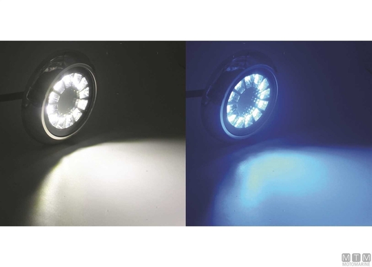 Dvobarvna 9-32V visoko svetleča podvodna LED luč.↵ IP68 vodotesno ohišje iz nerjavečega jekla 316 s silikonskim gelom zapečatena elektronika.↵ Z vgrajenim gonilnikom in zaščito pred pregrevanjem, 1,5 m napajalni kabel.↵ 5 izbirnih svetlobnih načinov: valovita bela in modra, stabilna modra, stabilna bela, stabilna bela in modra, utripajoča bela in modra.12/24V stikalo panel, IP65.