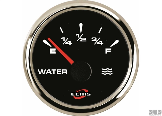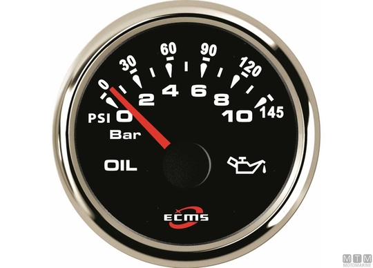 Merilniki Ecms Black Chrome 12/24V s priloženim ožičenim konektorjem Molex. Poliran okvir iz nerjavečega jekla in črna številčnica. Vodotesen IP67 zaščiten kupolast ne-fog leča. Prilagodljiva LED osvetlitev številčnice z več barvami. Nivojski merilniki se lahko nastavijo na katero koli vrednost impedance z uporabo zadnjega konfiguracijskega gumba. Prednastavljene so na standardno vrednost 0-190 Ohm. Oljni merilniki tlaka 5 in 10 barov so združljivi s standardnimi senzorji (10-180 Ohm), medtem ko je tisti za 30 barov združljiv samo z elektronskimi senzorji (0,5-4,5V). Ampermetri so popolni s senzorjem (šantom) za merjenje toka.
