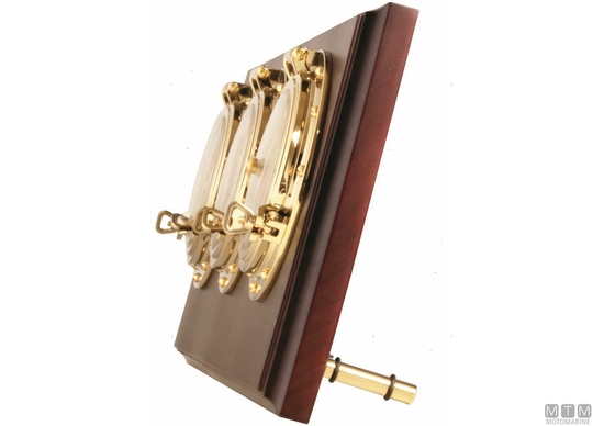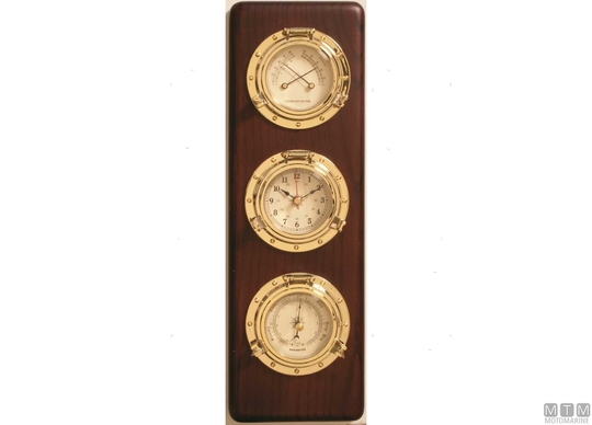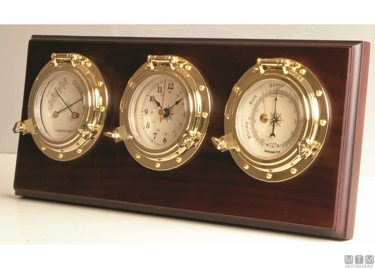 Instrumenti iz poliranega medenine plate Zirkonij vremenska postaja. Barometer, ura, termo/higrometer nameščeni na dragoceni leseni plošči. Horizontalna postaja je opremljena z osnovo za podporo mize. Premer instrumentov 100 mm.