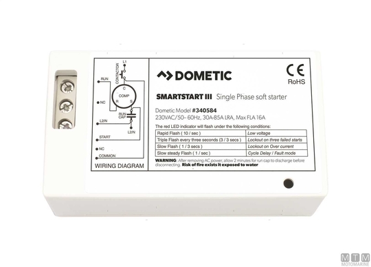 Accessories for Dometic MCS series air conditioners. Air Distribution Kit: Allows managing two compartments with a single air conditioner. Compatible only with T12/T16 models, it includes a 152 mm air duct, supply grille with plenum, and Y-connector. SmartStart III Protection: Protects the electrical system from power surges and drops occurring when the air conditioning system starts up. Recommended for systems ranging from 30k to 85k BTU/h (k = x1000).Sound Cover Silencer: A very easy-to-install cover designed to minimize noise produced by the compressor.