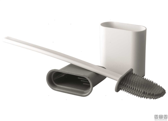 Kompaktna ščetka za morsko stranišče s prilagodljivo silikonsko ščetko. Ohišje iz polimera z odstranljivim odcejalnim pladnjem. Namestitev brez vrtanja ali vijakov z močnim lepilnim kavljem, ki je priložen.