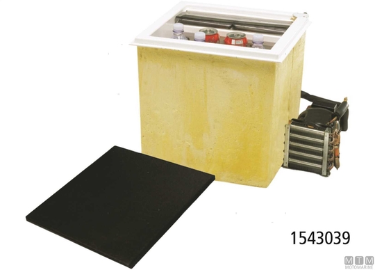 Hladilnik z zgornjim polnjenjem z zunanjim 12/24V hladilnikom Danfoss, oddaljen do 1,5 metra in mehanskim termostatom.
