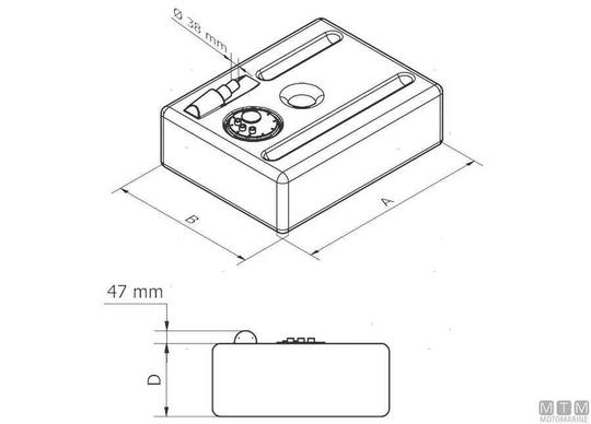 Pravokotni križno povezani rezervoar za gorivo iz polietilena s predoblikovanimi priključki za prve vgradnje OEM. Vključno z inšpekcijsko odprtino s 17/19 mm odzračevalnikom, cevjo za vstavljanje goriva premera 12 mm in navojnim pokrovom. Za dopolnitev z vstopno odprtino premera 38/50/60 mm. Certifikat RINa CE-ISO21487.