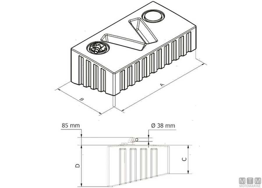 Stranski trup v obliki prepletenega rezervoarja za gorivo iz polietilena s kontrolno odprtino, 17/19 mm odzračevalnim ventilom, 38/50/60 mm dovodom in 12 mm cevjo za zalivanje goriva. CE-ISO21487 certifikat.